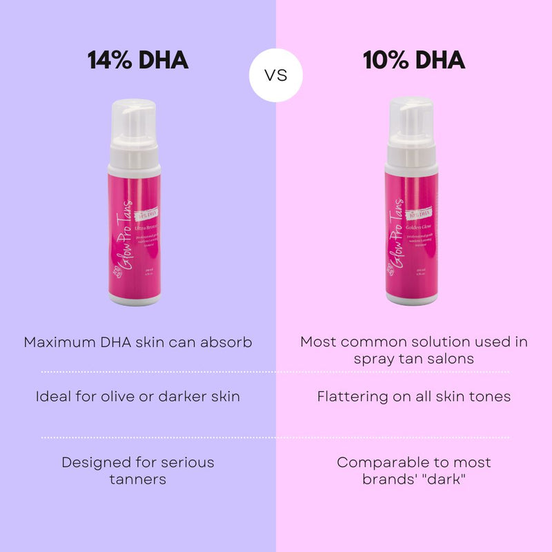 Lower concentrations of DHA are best for light skin tones, and higher numbers on dark skin tones. Our strongest formula, 14% DHA, is the maximum amount of DHA the skin can absorb at one time and gives you the darkest tan possible for your skin tone! Our 14% DHA concentration is recommended for experienced tanners looking to achieve their darkest bronze. The most widely used formulas in the US are in the medium range of 8-10%, which will suit almost all skin tones. The chart below will help you determine which solution is the best fit for you.